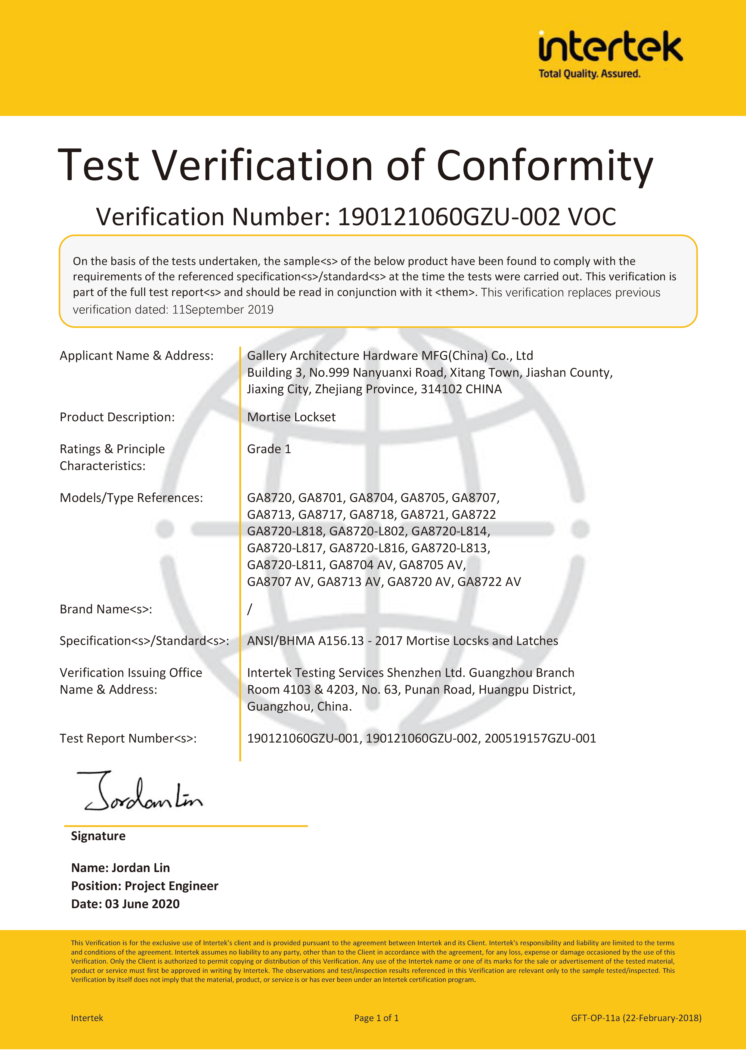 浙江堅迪五金制造有限公司始建于 1995 年。自 2003 開始,公司致力于高標準商業(yè)鎖的研發(fā)工作,并于 2006 及 2007 年,8700 插芯鎖系列獲得美國國家標準 ANSI A 156.13-2005 一級、ANSI A 156.2-2003 二級和美國 UL 10C3 小時防火測試認證。自 1998 年以來,公司不斷提升產品和客戶服務品質,并獲得了 ISO 9001 的認證。